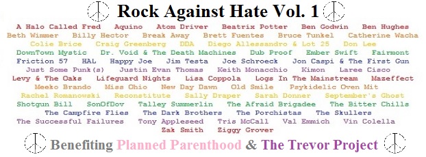 |  Rock Against Hate Volume 7 Track Listing Benefiting Trevor Project 1 Blisstique - " Dream " 2 Jill Sobule - " America Back (Live Version) " 3 Wally Chris Hoffner and the Noontime Nappers - " Vladimir " 4 Ferocious Designs - " Peace of Mind (Serenity Mix) " 5 Orbis Max - " Summerville " 6 Bruce Tunkel - " Piece Of Paradise " 7 Ali Zanders - " TRANSCEND " 8 Teen Idle - " Things You Say (Live at Anchor Rock Club) " 9 Chitinous Mandible - " All Belong " 10 Ken Kusama - " Evermore (Demo) " 11 Michael Aquino (feat. Declan Remus and Christian Davis) - " Testing, Testing " 12 Blasfemme - " You Can't Stop Us " 13 Greg McGarvey - " Dead Painters Painting The Sky (Ain't-No-Drums Mix) " 14 Jon Caspi - " Always Looking (Solo Version) " 15 The Mighty Alrighty - " Living Room (Demo) " 16 Jason Didner - " Truth to Power (Acoustic) " 17 Tommy Strazza - " One Day (2025 Version) " 18 Frank Patrouch - " You Gotta Go " 19 Mark Parker - " Ducking Punches (Remix) " 20 Mark Owen Nutto & The Unemployed Teachers - " Captain Fantastic (2025 Mix) " 21 The Winter Sounds - " San Francisco (Demo) " |  Rock Against Hate Volume 8 Track Listing Benefiting No More Dysphoria 1 Jason Didner - " I Want You To Be Yourself (Acoustic) " 2 Hit Like A Girl - " Route 1 in New Brunswick, NJ " 3 Kookie - " Shoot Me If You Can " 4 Catherine Wacha - " People Like Us " 5 Ciara Zwicker - " Villains " 6 Wally Chris Hoffner and the Noontime Nappers - " Agent Orange (Big Dreams, Little Schemes) " 7 The Mighty Alrighty - " Forgiveness (Demo) " 8 Bern Strong - " Might Get Kissed " 9 Sam Tunkel - " Inner City Lullaby " 10 Anthony Walker - " Fairweather " 11 Worm's Eye View / Maravines - " Soft (Alternate Version) " 12 Jon Caspi & Pete Jager - " We Don't Talk About It (Live at JSMP) " 13 Mick Chorba - " Nothin Like Nothin " 14 Bruce Donnola - " No Destination for the Rose " 15 Happy Joe - " Bad Money " 16 Blasfemme - " Late Bloomer " 17 erase:rewind - " Scene From a Five Dollar Basement Show (Demo) " 18 Sad About Girls - " Galaxy Girl " 19 Ferocious Designs - " It's All Around You (Techno Demo) " 20 The Winter Sounds - " Frederick Douglass is Back From the Dead (Demo) " 21 The Delphobics - " This Is What We Are " 22 Mark Owen Nutto & The Unemployed Teachers - " The Rainbow Song (2025 Mix) " |